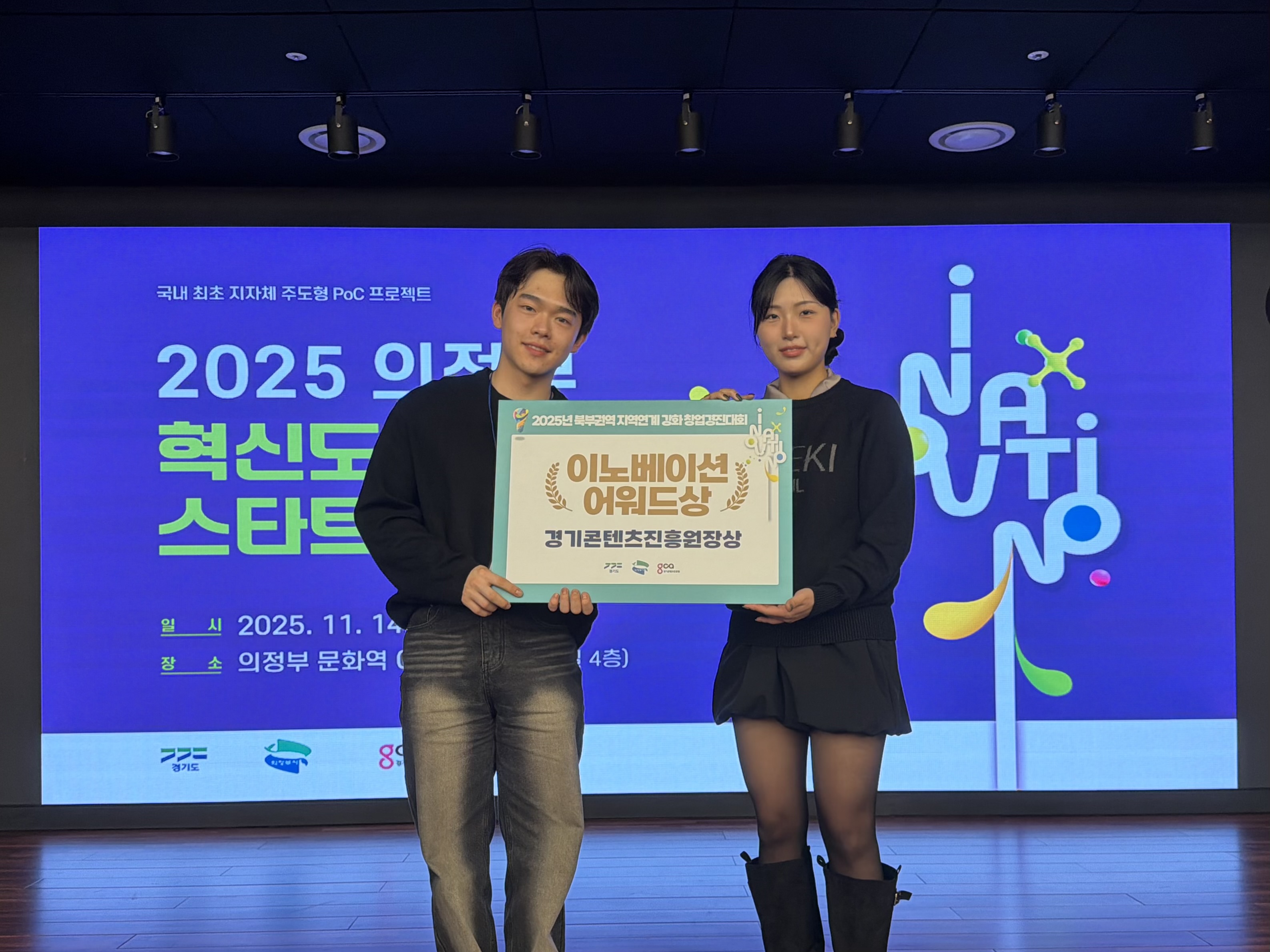 2025년 11월 14일(금) 의정부문화역 이음(모듬홀)에서 경기콘텐츠진흥원이 주최한 ‘2025 북부권역 지역연계 강화 지원 학생 부문 창업경진대회’ 본선 발표 및 시상식이 진행되었다.